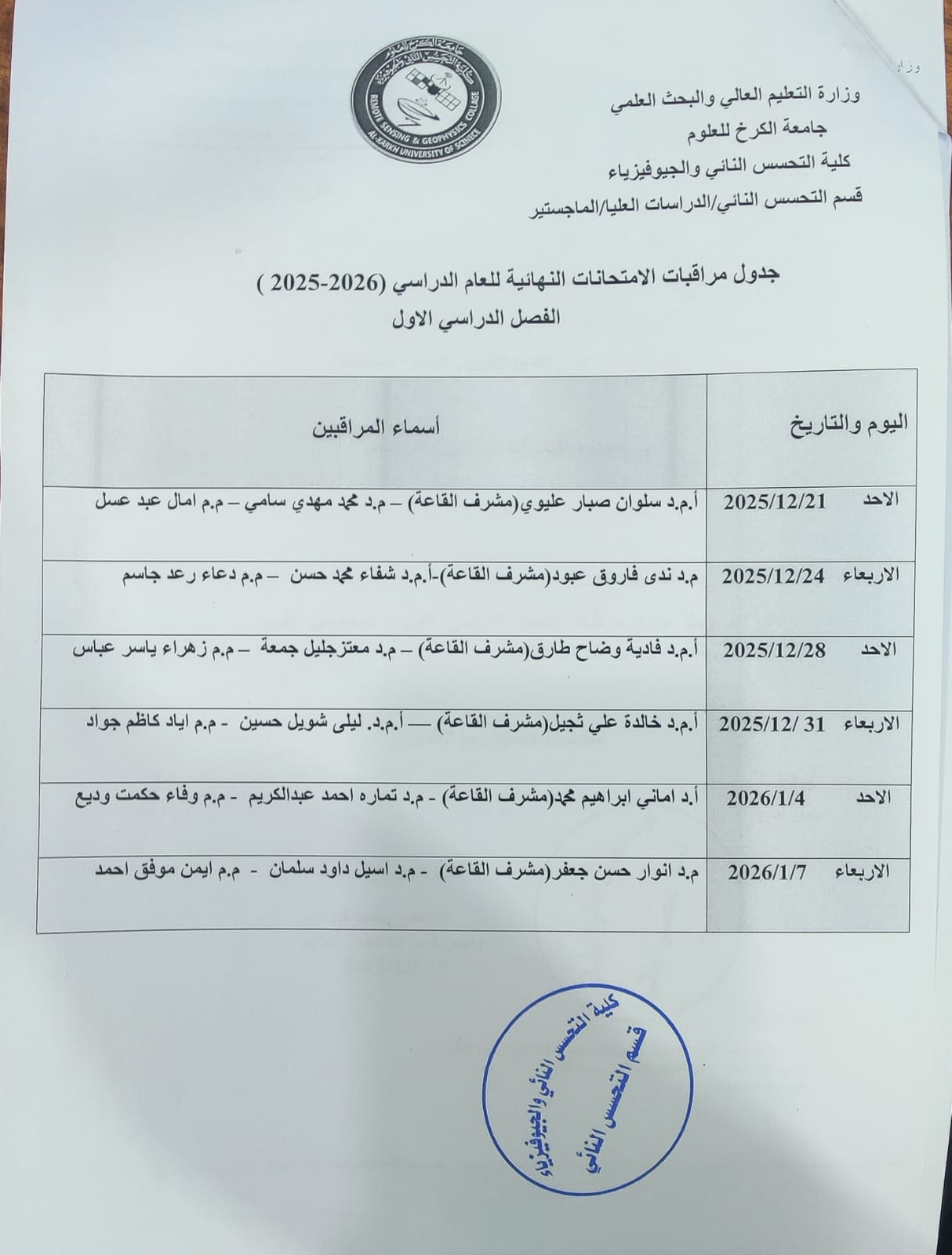 تُعلن جامعة الكرخ للعلوم / كلية التحسس النائي والجيوفيزياء / قسم التحسس النائي – الدراسات العليا (الماجستير) عن إطلاق جدول المراقبات للامتحانات النهائية للعام الدراسي 2025–2026 / الفصل الدراسي الأول.