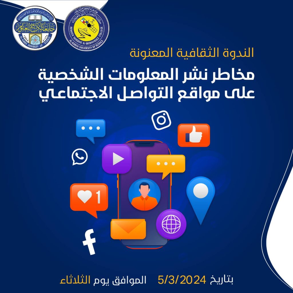 نظمت كلية التحسس النائي والجيوفيزياء يوم امس الثلاثاء الموافق 5/3/2024 ندوة ثقافية عن مخاطر نشر المعلومات الشخصية على مواقع التواصل الاجتماعي