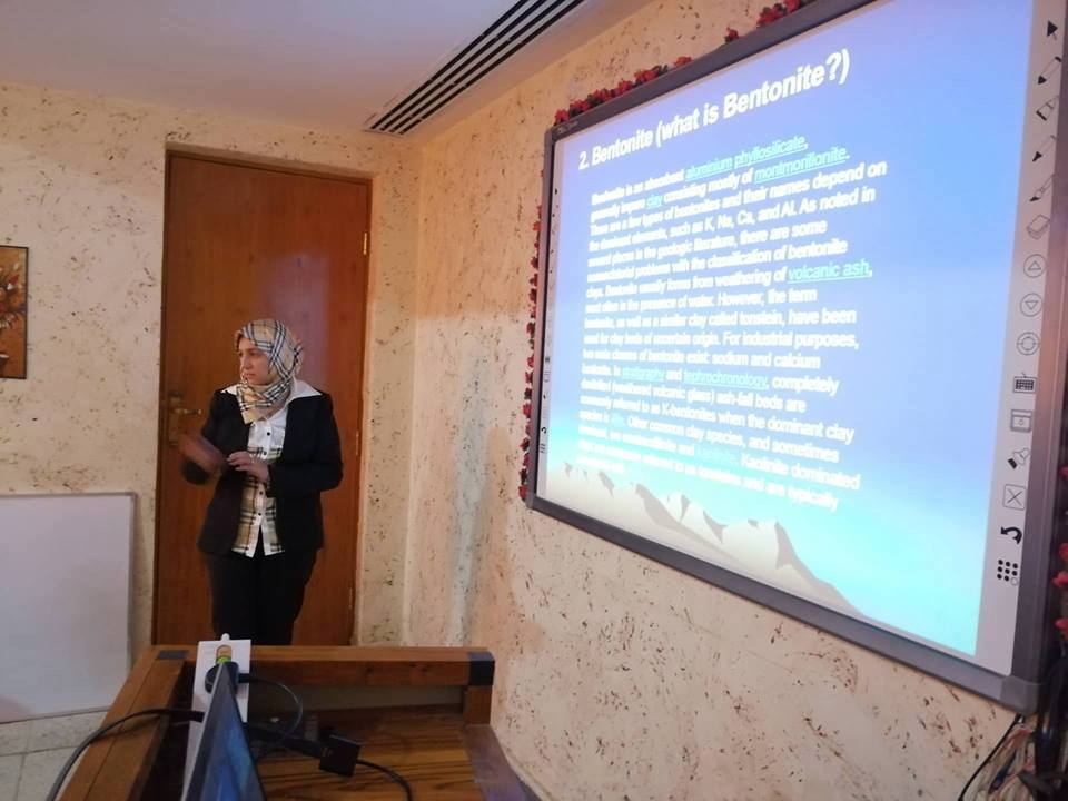 وهدفت المحاضرة تعريف المجتمع بالاهمية الصناعية للمعادن واستخداماتها ولا سيما معدن البنتونايت والذي يسمى باللغة العامية (طين خاوة) الذي يستخدم في مجالات عدة ، اذ يستخدم في حفر الابار النفطية وكذلك في مجالات طبية وصناعية كثيرة، وبينت المحاضرة ان المعدن بشكله الخام يوجود في مناطق عديدة في العراق حيث يكثر في المنطقة الشمالية ضمن نطاق الالتواءات العالية وفي منطقة السهل الرسوبي ويظهر نتيجة تجوبة الرماد البركاني.
