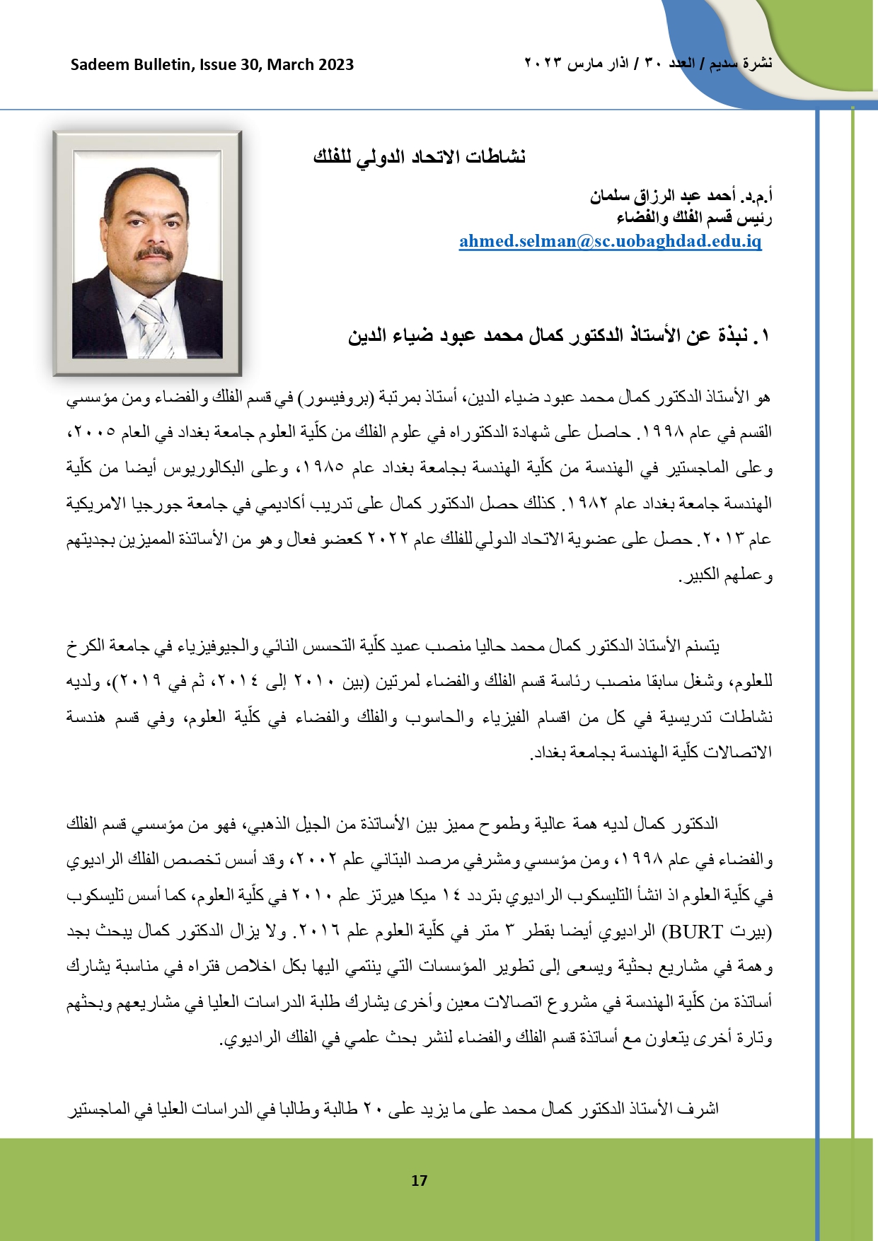 وبهذا تتقدم اسرة كلية التحسس النائي بالمباركة والتهنئة للزميلة فاطمة كريم خجوري متمنين لها دوام النجاح والعطاء في المسيرة العلمية القادمة