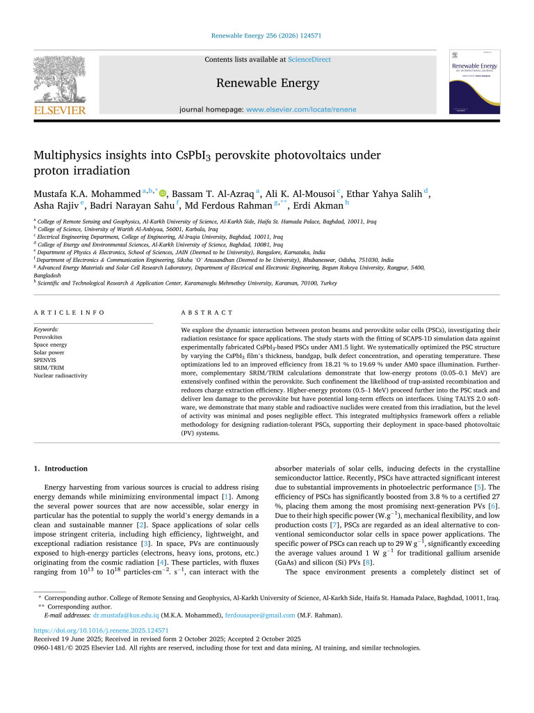 بحثًا في مجلة Renewable Energy المصنفة ضمن الربع الأول (Q1) في قواعد تصنيف Clarivate وScopus، ذات معامل استشهاد (17.6= CiteScore) ومعامل تأثير (9.1 = Impact Factor) ، ويتناول البحث تصميم خلايا شمسية تُستخدم في المركبات الفضائية والأقمار الاصطناعية واختبار مقاومتها لتأثير الإشعاع الفضائي بما في ذلك البروتونات والإلكترونات والنوى الثقيلة في المدارات القريبة والبعيدة على أداء منظومات القدرة، مع التطرق إلى خصوصية البيئة المدارية لمحطة الفضاء الدولية ISS بوصفها نموذجًا واقعيًا لاختبار الاعتمادية، ويتضمن العمل إطارًا متعدد الفيزياء يجمع بين المحاكاة الفيزيائية المتقدمة وتحليل التفاعل الإشعاعي مع المواد عبر دمج أدوات متقدمة هي SCAPS-1D لمحاكاة الخلية وSRIM/TRIM لمسارات الأيونات وإزاحات الذرات وSPENVIS لنمذجة بيئة الإشعاع المداري وTALYS 2.0 لتقييم النواتج النووية والتنشيط الإشعاعي وقد أظهرت الحسابات أن النشاط الإشعاعي المتولد متناه الصغر ولا يهدد سلامة المنظومات تحت ظروف التدرع الفضائي المعتادة.